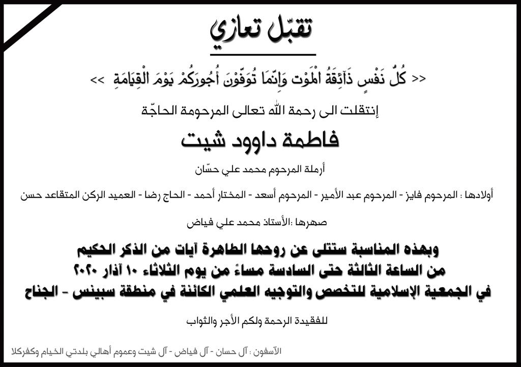 تتقبّل العائلة التعازي في بيروت يوم الثلاثاء 10 آذار 2020 من الساعة الثالثة بعد الظهر لغاية السادسة مساءً في مركز جمعية التخصص والتوجيه العلمي الكائن في محلة الجناح قرب مركز أمن الدولة.