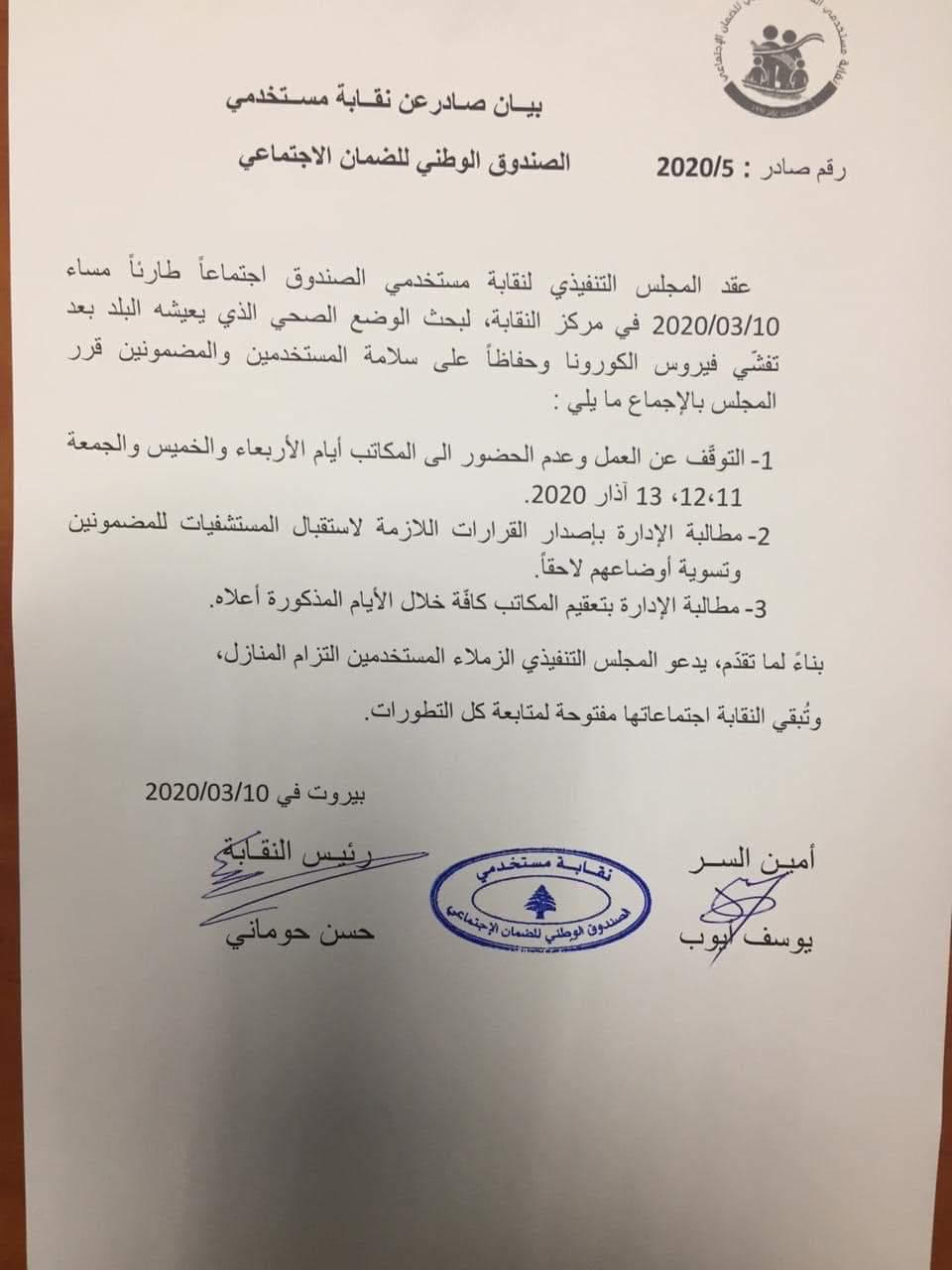 عقد المجلس التنفيذي لنقابة مستخدمي الصندوق اجتماعا طارئا مساء 2020/03/10 في مركز النقابة، لبحث الوضع الصحي الذي يعيشه البلد بعد تفشي فيروس الكورونا وحفاظأ على سلامة المستخدمين والمضمونين قرر
