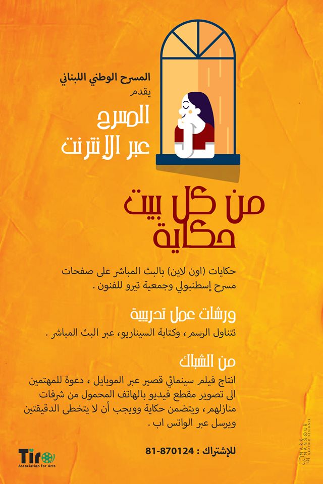 أطلقت إدارة «مسرح إسطنبولي» و«جمعية تيرو للفنون» و«المسرح الوطني البناني» عروضاً حكواتية «لايف» عبر الإنترنت تحت شعار« من كل بيت حكاية» وذلك بالبث المباشر عبر الفيسبوك من الحكواتيين الى المنازل ضمن برنامج «المسرح والسينما عبر الإنترنت»، والذي يتضمن اقامة ورشات عمل تدريبية للأطفال، والشباب، تتناول الرسم، وكتابة السيناريو، عبر الإنترنت، الى جانب تنفيذ مشروع «من الشباك» الذي يتضمن انتاج فيلم سينمائي قصير عبر الموبايل ، مع دعوة المهتمين الى تصوير مقطع فيديو بالهاتف المحمول من شرفات منازلهم، على أن يتضمن الشريط، قصة، أو اغنية، أو قصيدة، أو عزفاً للموسيقى ، ويجب أن لا يتخطى الدقيقتين. كما وأطلقت الجمعية عبر موقعها الإلكتروني عروضاً للأفلام السّينمائية القصيرة والتي شاركت في مهرجان صور السينمائي الدولي للأفلام القصيرة، ومجموعة أفلام قصيرة من إنتاج تيرو للفنون . وأكد مؤسّس «المسرح الوطني اللبناني» الممثل والمخرج قاسم إسطنبولي "أنه وبسبب الظروف التي تعاني منها البشرية نحاول العمل من فتح صلة وصل بين الفنانين والجمهور وذلك حفاظاً على السلامة العامة والتواصل من خلال منصاتنا لمن يرغب بعرض أعماله الفنية والتعبير عبر الفنون المختلفة ومشاهدة الأعمال الفنية " .
