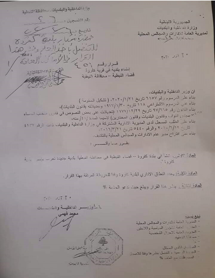 أصدر وزير الداخلية والبلديات محمد فهمي قرارا حمل الرقم451 قضى بإنشاء في بلدة كفروة - قضاء النبطية في محافظة النبطية بلدية جديدة تعرف بإسم " بلدية كفروة"