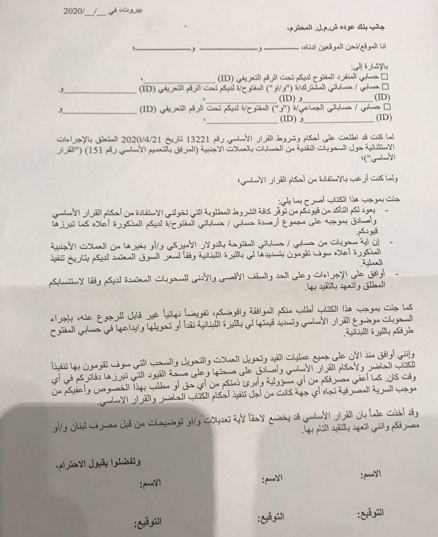 وبموجب الكتاب الذي يفرض المصرف على العميل التوقيع عليه، يتم تحويل حسابه من الدولار إلى الليرة بشكل نهائي. وينص صراحة في إحدى فقراته على الآتي: بموجب هذا الكتاب أطلب منكم الموافقة وأفوضكم تفويضاً نهائياً غير قابل للرجوع عنه، بإجراء السحوبات موضوع القرار الأساسي وتسديد قيمته بالليرة اللبنانية نقداً، أو تحويلها وإيداعها في حسابي المفتوح من طرفكم بالليرة...