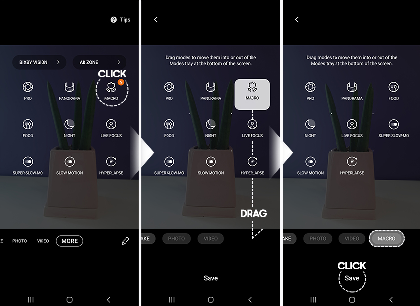 هل تتساءل كيف يمكنك أيضاً إضفاء الحيوية على المشاهد المصغرة التي تقون بتصويرها باستخدام Galaxy A51 أو Galaxy A71؟ قم بفتح تطبيق الكاميرا ، وانقر فوق "المزيد" في شريط أدوات خيارات الكاميرا الرئيسية ، وحدد خيار الماكرو لالتقاط الصور. للوصول السريع إلى عدسة الماكرو في أي وقت ، يمكنك إضافة رمز عدسة الماكرو إلى شريط أدوات الكاميرا الرئيسي عن طريق الضغط على الرمز وسحبه من قائمة الخيارات "المزيد".