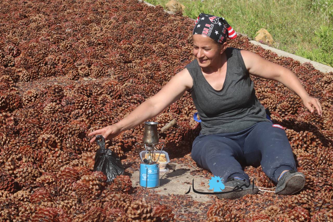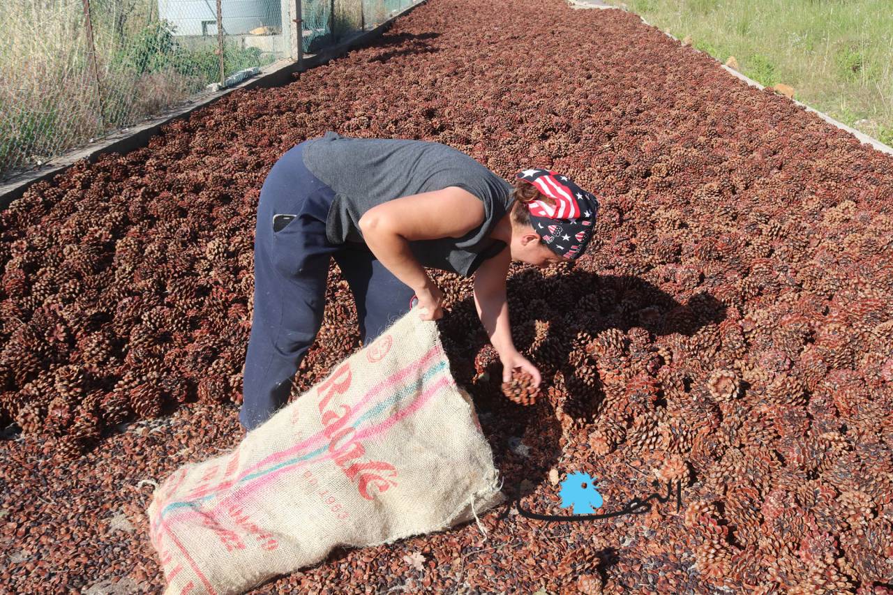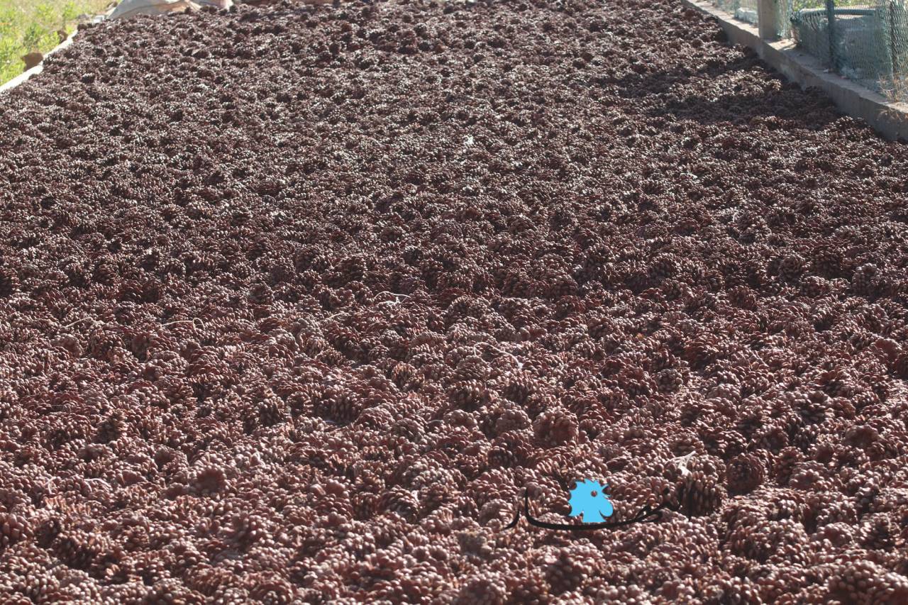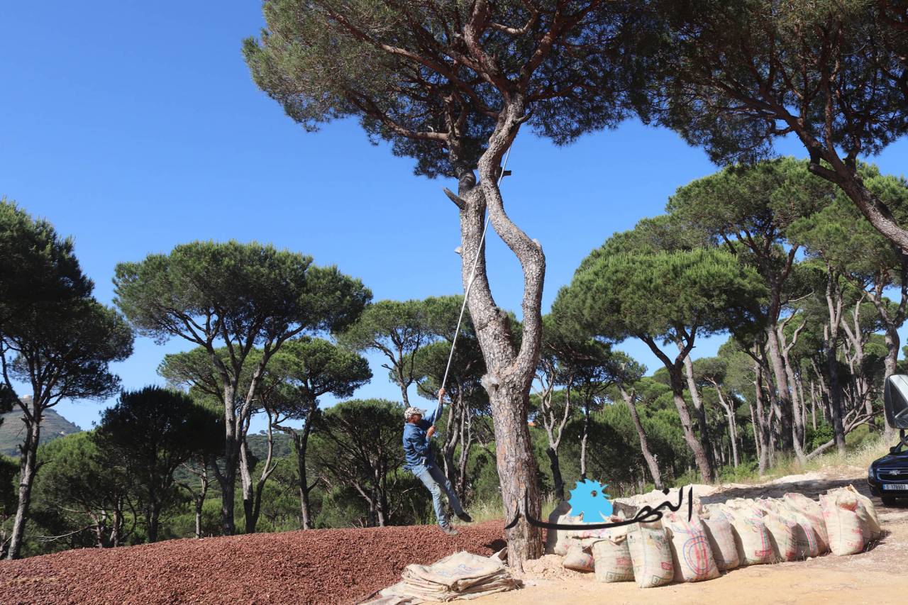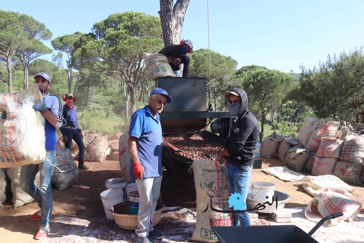 وموسم القطاف الذي بدأ منذ فترة ويستمر لغاية الشهر الحالي يجري على قدم وساق ويمر بمراحل عدة حتى يصبح جاهزاً لتصريفه وبيعه. وقالت ابنة بكاسين مارتا حرفوش المتعلقة بأرض أجدادها وآبائها، ولديها لهفة في جمع أكواز الصنوبر وتنقيتها منذ أكثر من 20 عاماً، إن المرحلة الأولى لبدء العمل في الموسم هي الأصعب والأخطر، تبدأ بإسقاط الأكواز عن أغصان الأشجار التي يصل ارتفاعها إلى أكثر من عشرة أمتار عبر تسلق شخص أو شخصين على الشجرة ونزع الأكواز بقضيب من القصب أو الحديد تسمى "معليقة" على الأرض، والمرحلة الثانية يتم فيها جمع الأكواز وفلشها على الطرقات أو على أسطح المنازل وتعريضها لأشعة الشمس حتى تجفّ، وفي المرحلة الأخيرة يصار إلى تعريب حبات الصنوبر عن الأكواز عبر آلات حديثة، وبعد تنظيف الحبّات تعمل آلة خاصة على تكسيرها واستخراج الصنوبر منها.