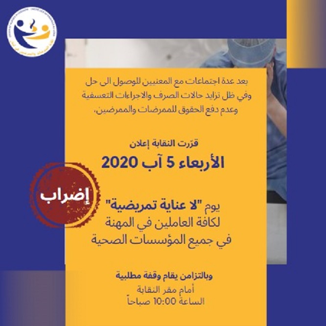 بعد عدّة إجتماعات مع المعنيين للوصول إلى حل للأزمة التي يعاني منها القطاع الصحي، وفي ظل تزايد حالات الصرف والإجراءات التعسفية وعدم دفع الحقوق للممرضات والممرضين، قرّرت نقابة الممرضات والممرضين إعلان يوم الأربعاء 5 آب 2020 يوم إضراب عن العمل لكافة العاملين في المهنة في جميع المؤسسات الصحية مع الأخذ بعين الاعتبار الحالات الضرورية وصحة المرضى.