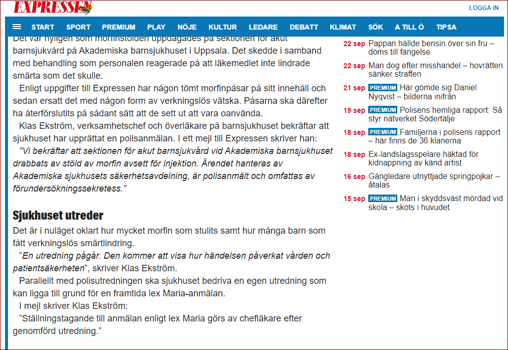 ووفقا لصحيفة "إكسبرسن" السويدية، فقد تم اكتشاف سرقة المورفين مؤخرًا، فى قسم رعاية الأطفال الطارئة فى المستشفى، عندما وجد بعض الممرضين أن الدواء الذى يقدموه للأطفال، لم يخفف آلامهم كما ينبغى، مشيرة إلى أن اللص أعاد إغلاق أكياس الدواء بطريقة تبدو وكأنها جديدة وغير مستخدمة.