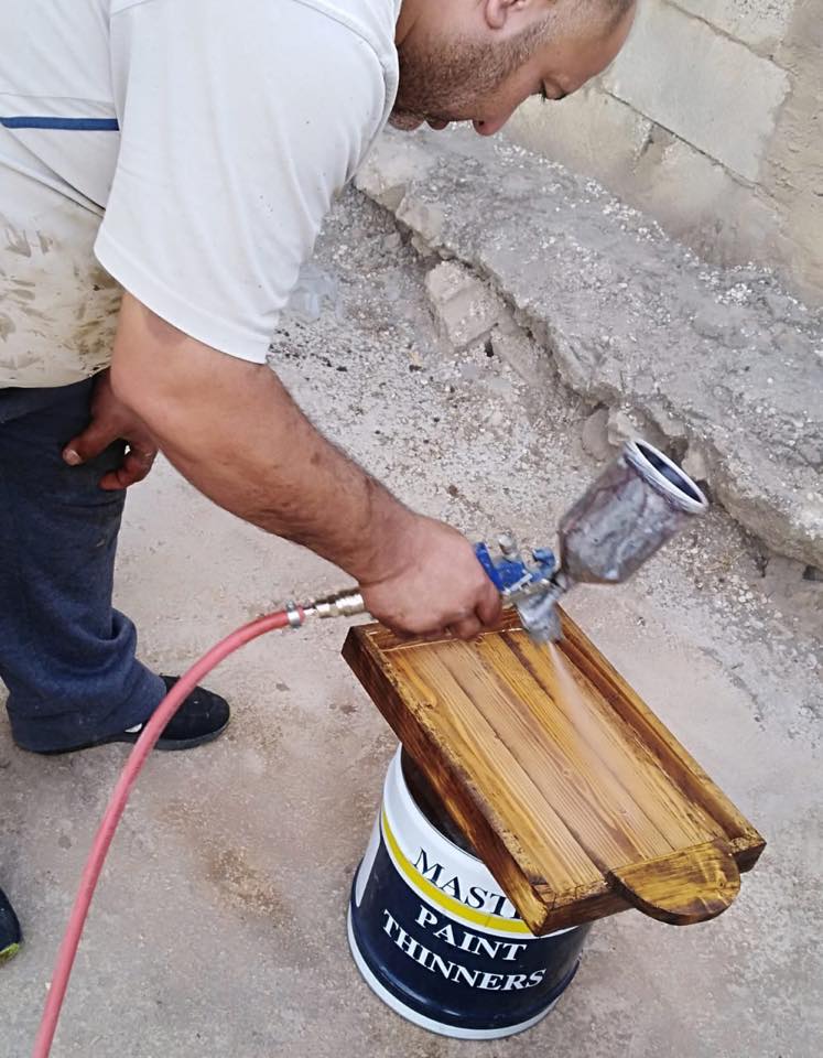 وأعمل على تنظيفها وحفّها وحرقها، ودهنها بمادة اللكر، وأحيانًا مادة التعتيق حسب طلب الزبون، كما بإمكاني تصنيع خزائن مطبخ وغرف نوم، وأستعمل بعض المعدات التقليدية وآلات كهربائية أخرى، إضافة للمسامير والبراغي والغرا، وأضع قوائم معدنية لكل قطعة حفاظًا عليها من المياه أثناء تنظيف الأرض الموضوعة عليها. وأُطلي رأس المسمار والبراغي بمعجونة الحديد لإخفاء منظره، إنما بعض الزبائن يفضلون بقائه ظاهرًا.