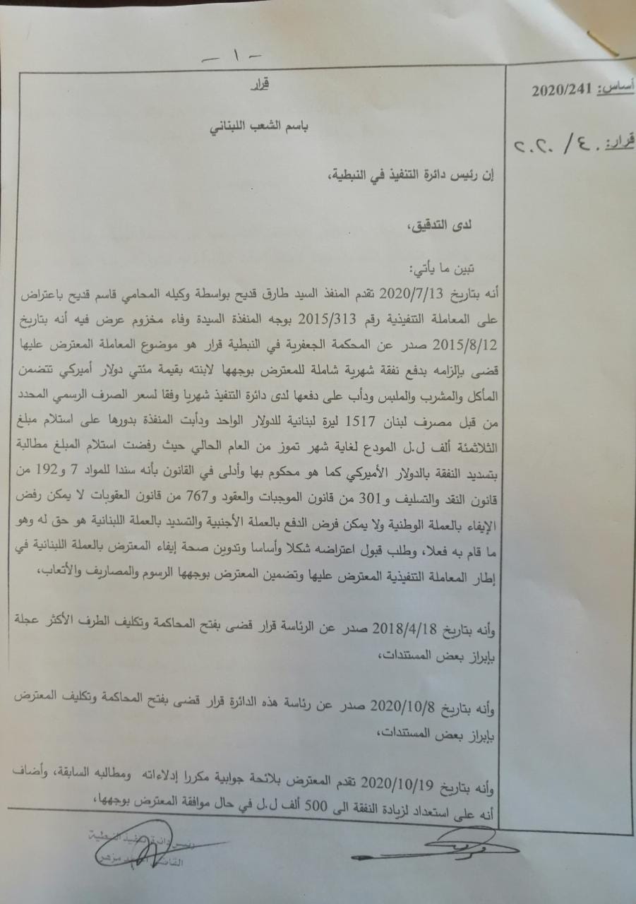 اصدر رئيس دائرة تنفيذ النبطية القاضي أحمد مزهر قرارا قضائيا بمثابة انتصار للمرأة