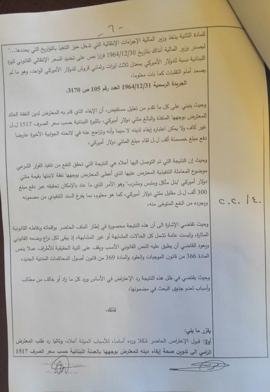 بالعملة اللبنانية هو حقّ له وهو ما قام به فعلاً، وطلب قبول اعتراضه شكلاً