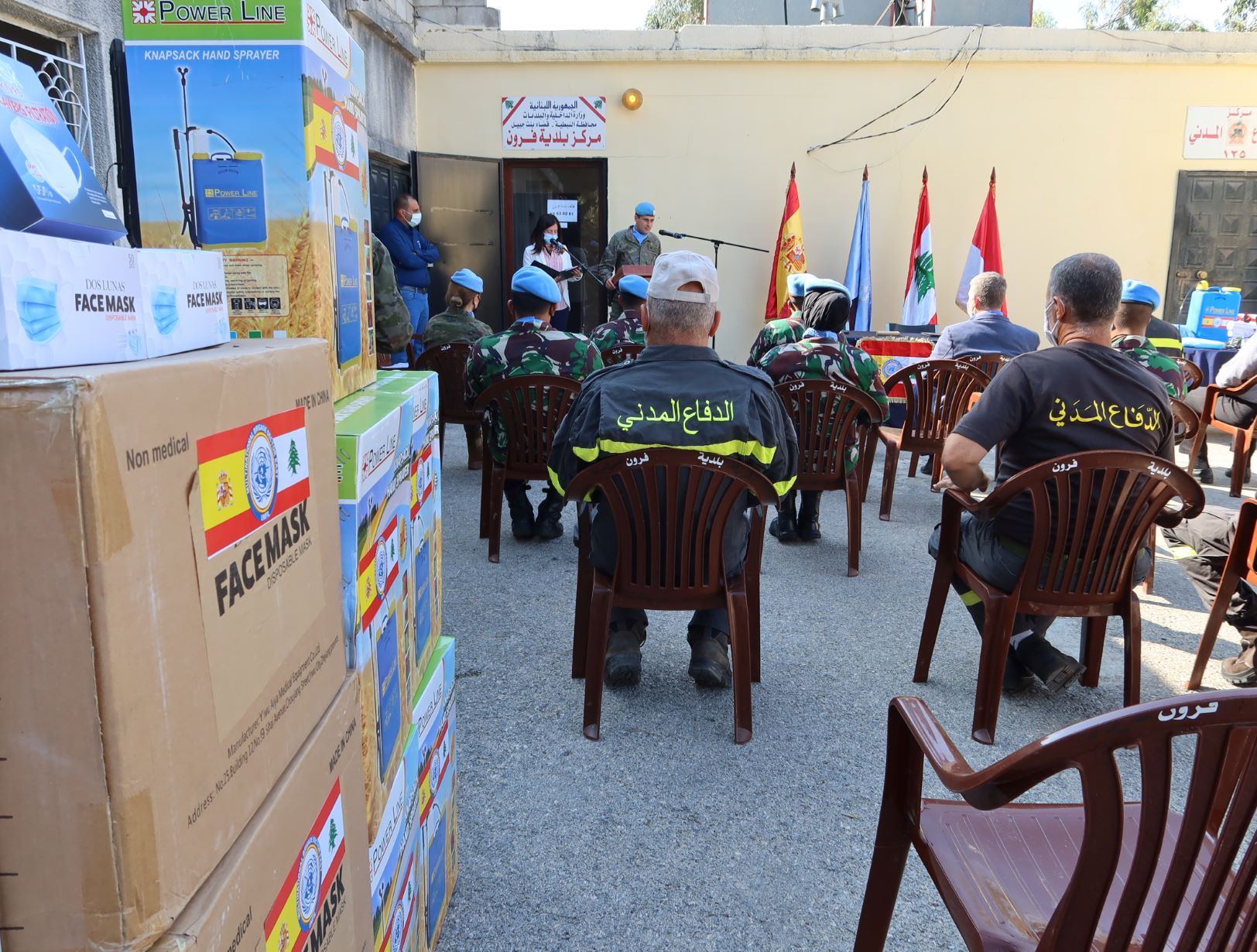 واصل جنود حفظ السلام الإسبان التابعون لليونيفيل جهودهم المستمرة لمساعدة المجتمعات المضيفة في المعركة المشتركة ضد فيروس كورونا المستجد COVID-19 من خلال التبرع بعدة معدات لمراكز التنمية الاجتماعية (SDC´s) في فرون (قضاء بنت جبيل) وراشيا الفخار (قضاء حاصبيا) في جنوب شرق لبنان. إن التبرع بمعدات الحماية الشخصية وغيرها من المستلزمات الضرورية لاحتواء الفيروس ، دعماً لوزارة الصحة العامة اللبنانية ، سيفيد أكثر من 17 قرية ومؤسسة حكومية.
