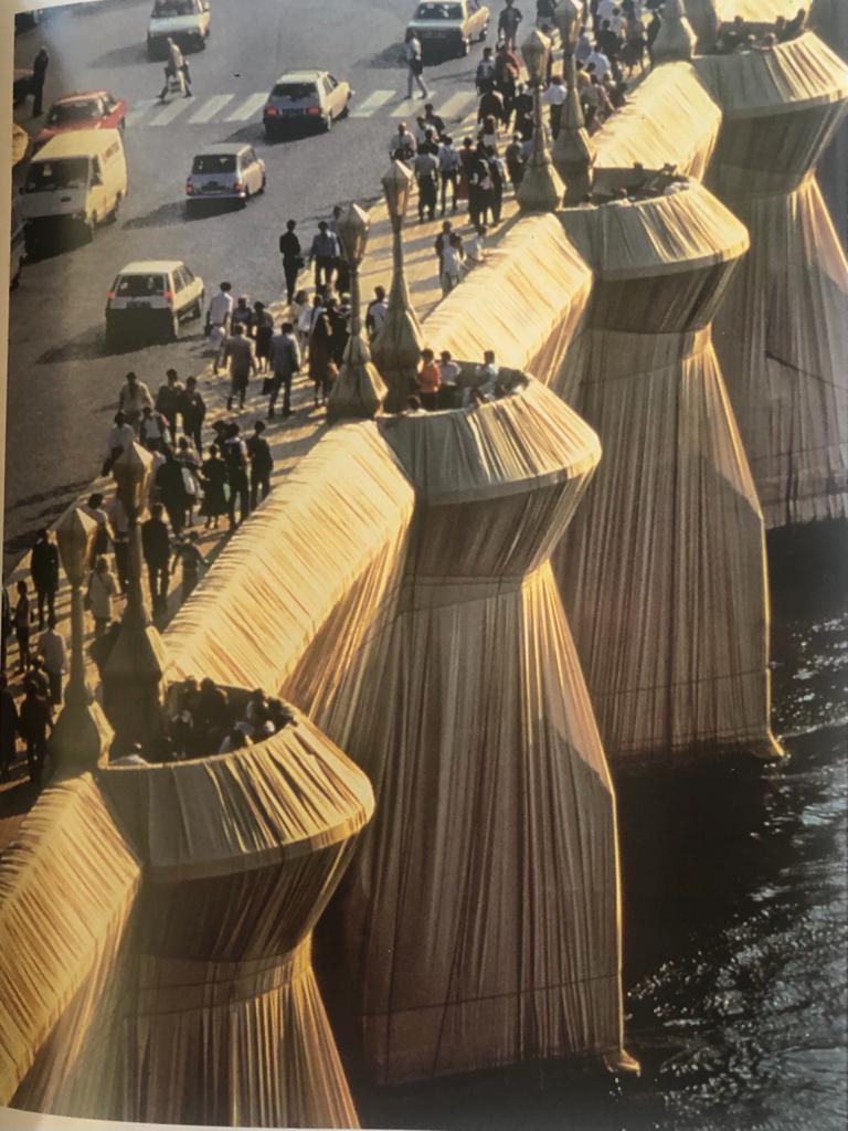 منذ عام 1975، طوّر الفنانان فكرة تغليف ما يُسمّى «الجسر الجديد» Le pont neuf في باريس (أصبح اليوم الجسر الأكثر قدماً في باريس) من خلال قماش، مصنوع من مادة البولياميد بلون حجر رمليّ مُذهّب، يُغطّي جوانب وقمم عقود الجسر الاثني عشر والحواجز والحواف والأرصفة وكل ما يوجد على الجسر من أشياء وتجهيزات (يستطيع المشاة السير على القماش).