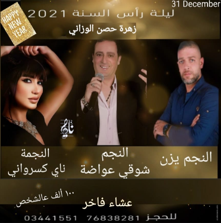 في هذه الاطار يقدّم منتجع زهرة الوزاني سهرة فنيّة رائعة، مع عشاء فاخر بأسعر مناسبة ومدروسة، مساء يوم الخميس 31 كانون الأول الجاري، يحييها نجموم السهرة: يزن، شوقي عواضة وناي كسرواني.