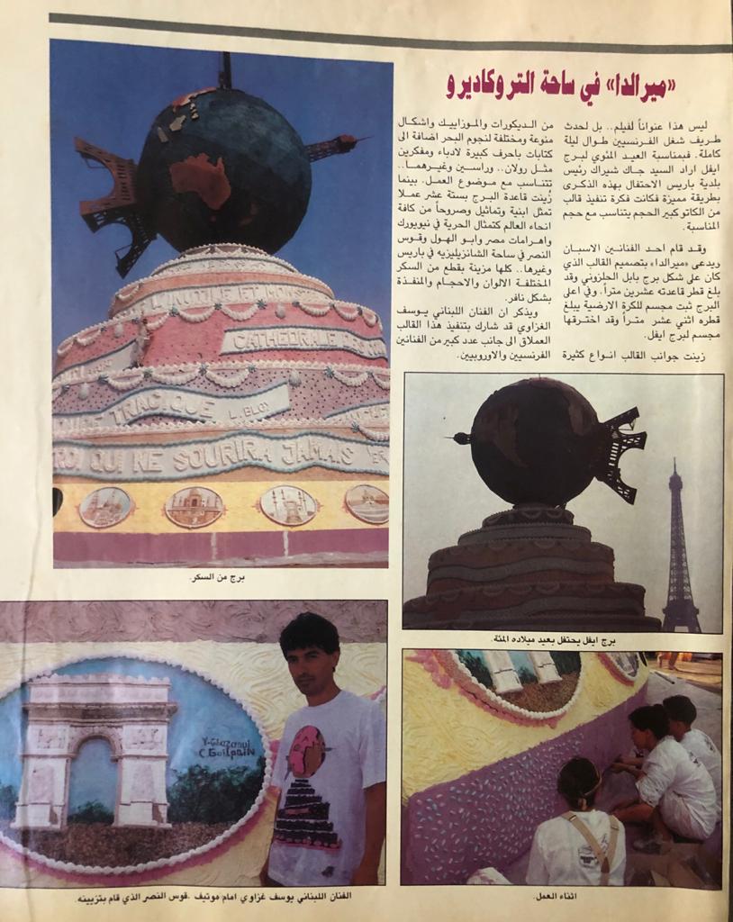 أمّا الموزاييك فله معه حكاية أخرى وتجارب كثيرة، فقد شارك بعمل عبارة عن نصب ضخم (مشروع ميرالدا) من الموزاييك بقطع السكّر بارتفاع ثلاثين متراً في ساحة التروكاديرو في باريس للاحتفال بالمئويّة الأولى لبناء برج إيفل؛ نفّذ العمل مجموعة من الفنانين الفرنسيّين، وكان غزاوي واحداً منهم (التفاصيل في كتاب غرنيكا الخيام). شارك في الاحتفال عند نهاية العمل معظم رؤساء دول العالم من القارات الخمس، فكان حدثاً عالميّاً مميّزاً..