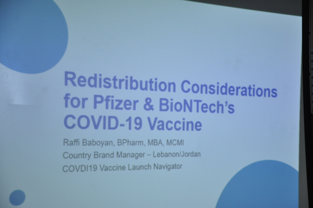 بعد ذلك شرح مندوبو شركة فايزر عن "برنامج التلقيح من حيث استيعاب طالبي اللقاح، واستعماله، والاهم تخزينه في برادات على درجة 70 تحت الصفر".