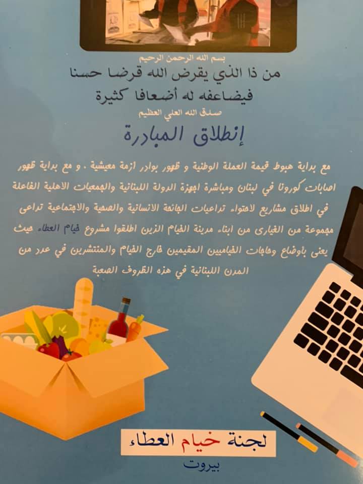 عندما عصفت الضائقة المالية والاقتصادية وكذلك عندما ضربت جائحة كورونا وطننا لبنان، تداعى مجموعة من المتطوعين من ابناء مدينة الخيام ،نائب رئيس البلدية ،رئيس بلدية سابق،أعضاء مجلس بلدي حالي و سابقون ،أطباء و مهندسون و محامون و فعاليات اجتماعية ،لاطلاق حملة تضامن مع اهلنا المنتشرين خارج الخيام ،من الشمال مرورا ببيروت الكبرى و البقاع و وصولا الى الجنوب ،،، بدأنا من ذواتنا و بمبادرات فردية ،توسعت الى المقربين و إزدادت توسعًا نحو المعارف و الاصدقاء ،وكبُرت فشملت مبادرين جدد ،اذهلونا بحبهم و عطفهم وغيرتهم واندفاعهم..