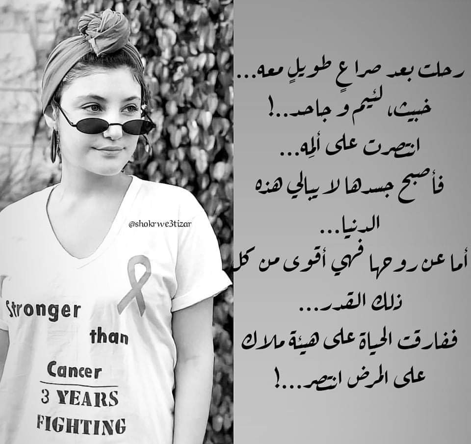 "3 سنين تعب... 3 سنين وجع... 3 سنين عذاب.. بس كمان 3 سنين أمل وإيمان وصبر.. 3 سنين أهل وأصحاب وحب ما بيتقدّر بثمن... 3 سنين امتحان من الله، وشو حلو هالامتحان!! شو حلو لما تشوف أصحابك وأهلك ورفقاتك حدّك بأصعب مرحلة عم تقطع بحياتك!! شو حلو تتقرب من ربّك و تشكره على كل شي. وشو حلو لما تعرف إنو الله هوي السند الوحيد بالحياة. وإنو ع قد ما بحبك ع قد ما بجربك!! شو حلو لما تنوجع وتتعذب وتوصل عالموت وترجع وما تلاقي إلّا ربك معك، وإنو ما بيتركك حتى بأصعب الحالات ...ما أجمل ابتلاء الله وما أقبحك يا سرطان!!"...