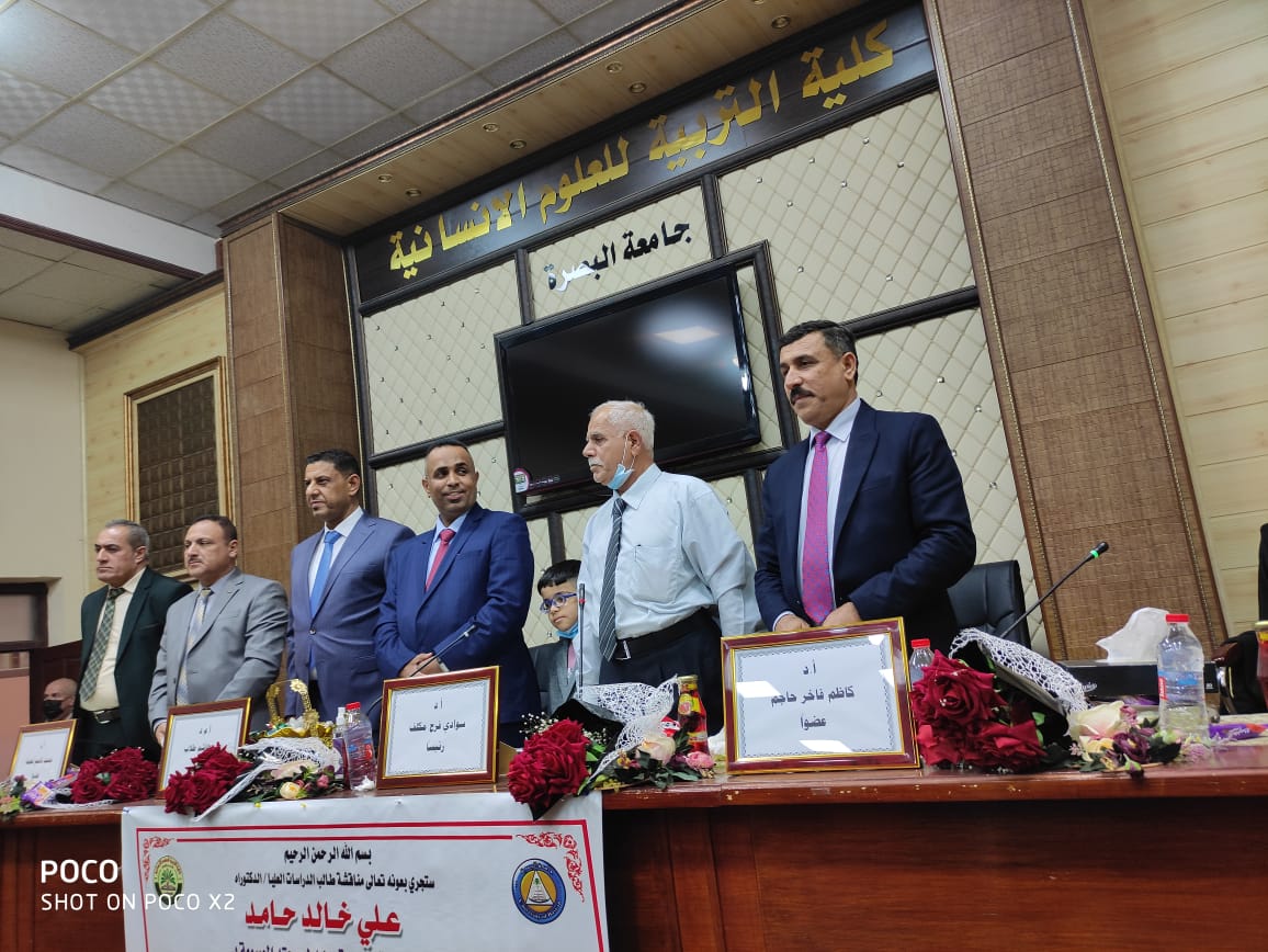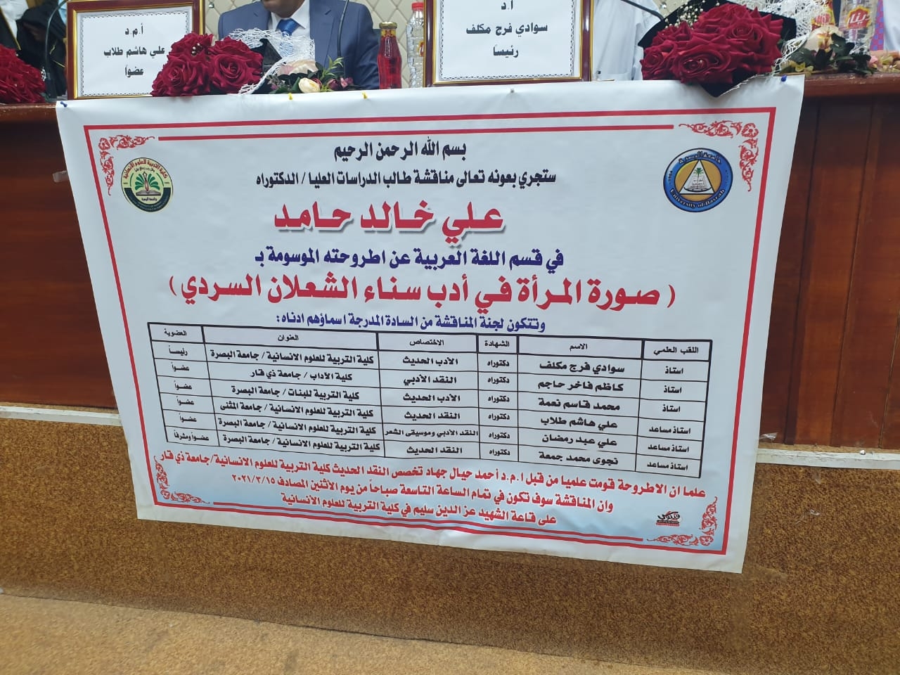 أشرف على الباحث في أطروحته هذه الدكتورة نجوى محمّد جمعة من جامعة البصرة، في حين تكوّنتْ لجنة المناقشة من كل من: د. نجوى محمد جمعة من جامعة البصرة/ عضواً ومشرفاً، ود. سواديّ فرج مكلف من جامعة البصرة/ رئيساً، ود. كاظم فاخر حاجم من جامعة ذي قار عضواً، ود. محمد قاسم نعمة من جامعة البصرة عضواً، ود. علي هاشم طلاب من جامعة المثنى عضواً، ود. علي عبد رمضان من جامعة البصرة عضواً.