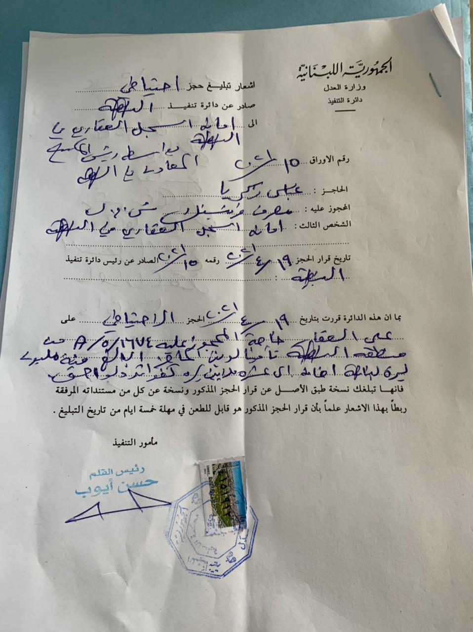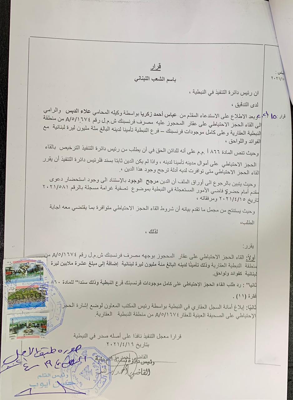 أصدر رئيس دائرة التنفيذ في قصر عدل النبطية القاضي أحمد مزهر قرارا قضائيا قضى بالحجز الاحتياطي على عقار يملكه "فرنسبنك" في مدينة النبطية تأمينا لدين احد المودعين لديه ، وهي المرة الثانية التي يتم فيها الحجز على العقار ذاته ولكن بدعوى من مودع اخر . وجاء في نص القرار الآتي: