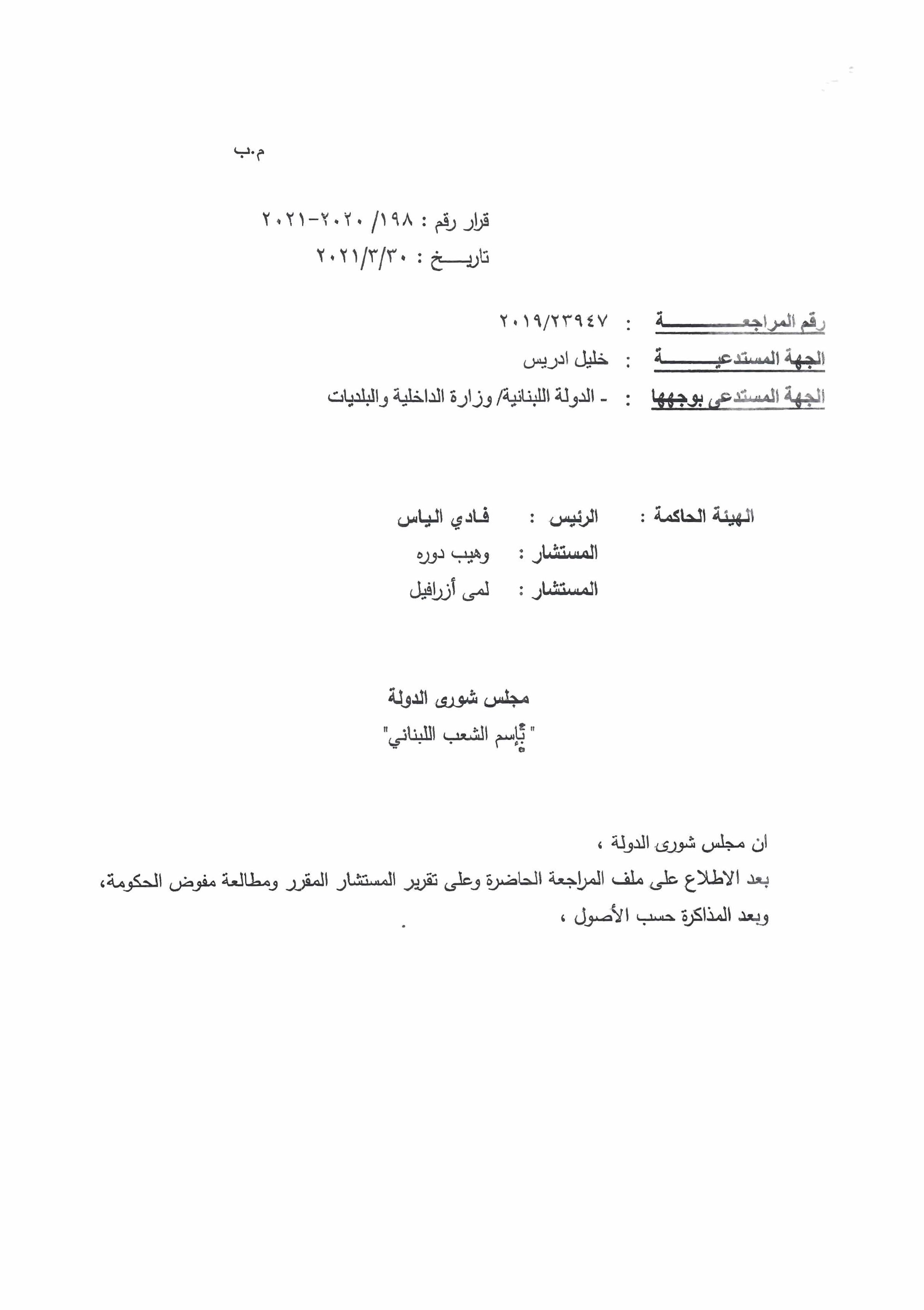 بتاريخ ٢٠٢١/٣/٣٠ صدر قرار قضائي عن جانب مجلس شورى الدولة، بناء على مراجعة مقدمة من قبلي، بتاريخ ٢٠١٩/١١/١٩ بصفتى عضو في مجلس بلدية الخيام، للطعن بقرار ايقاف عقد جلسات المجلس البلدي ايام السبت والعطل الرسمية والقاضي بإبطال هذا القرار بعد ان تم ايقاف تنفيذه سابقا بتاريخ ٢٠١٩/١٢/١٢ والسماح للبلديات كافة بممارسة مهامها في كل الاوقات والظروف.