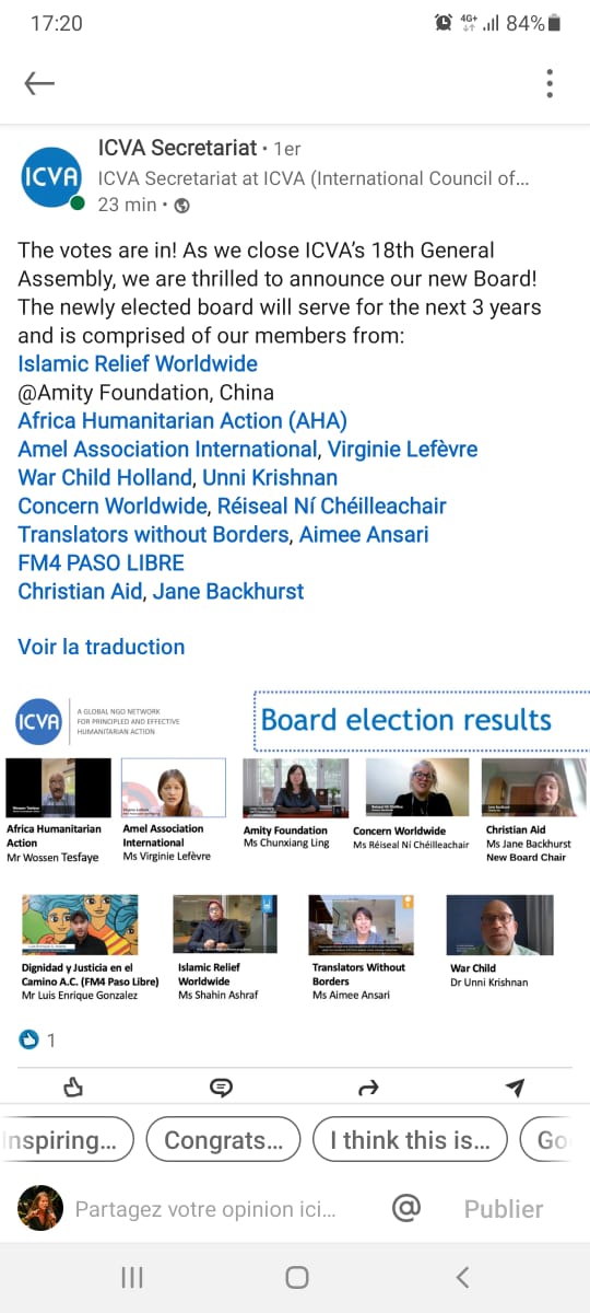 اُنتخبت مؤسسة عامل الدولية، عضواً في قيادة التحالف الدولي للهيئات التطوعية ICVA خلال الاجتماع السنوي للمنظمة في جنيف – سويسرا، مُمثلة بعضو الهيئة الإدارية فيرجيني لوفيفر، بعد أن حازت المؤسسة على نسبة أصوات مرتفعة، 54 صوتاً أعطي لها من الأعضاء المقترعين من كل أنحاء العالم.