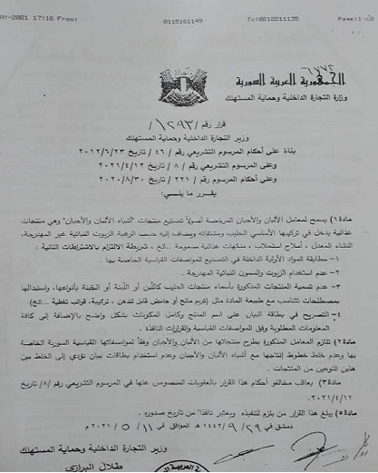 انتقادات حادة أثارها قرار الحكومة السورية بالسماح بتصنيع "أشباه الألبان والأجبان"، تركزت في معظمها حول أن القرار موجه لـ "أشباه المواطنين"