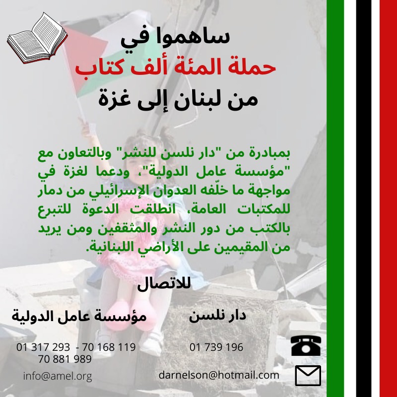 وإذ تطلق دار نلسن للنشر ومؤسسة عامل الدولية هذه الحملة، تثمّن عالياً صمود غزة والأراضي الفلسطينيّة والتضامن العالمي الواسع، من أجل رد العدوان عن أرض فلسطين، وتغليب العدالة وضمان حقوق الفلسطينيين.