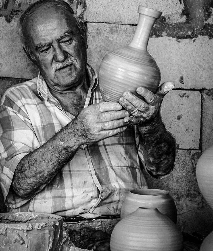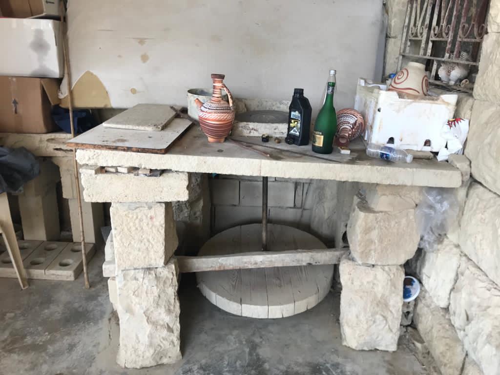 بعدها يأتي دور المعلم، صاحب الخبرة في عملية التصنيع الإفرادية لكل قطعة، عبر قالب دائري يتم تحريكه بالأرجل من خلال آلة تشبه ماكينة الخياطة.