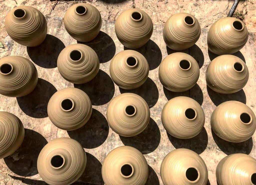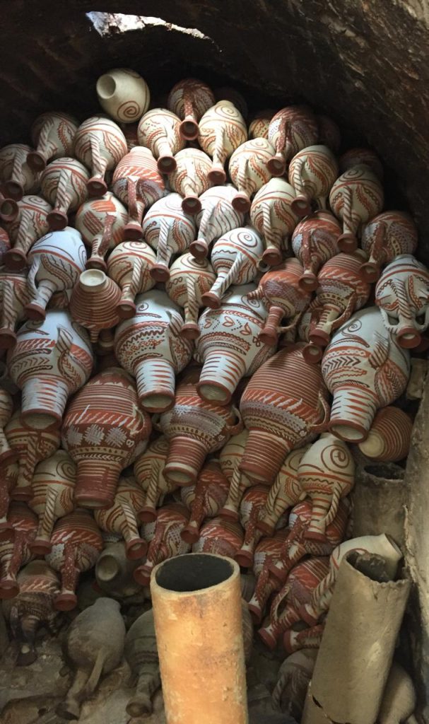 بعد ذلك تُجمع القطع المصنوعة، وتترك لتجف داخل الغرف لكون أشعة الشمس القوية تسبب في تشققها، وبعد أن تجف بشكل كامل توضع الأواني الفخارية في المرحلة الأخيرة من صناعتها داخل فرن ناري علي درجة الحرارة من ستين درجة، وترتفع تدريجياً لتصل إلى 1200 درجة ويترك الفرن مغلقاً لمدة يوم ويتم تزيينها بعد إخراجها وتبريدها بإصباغ ورسوم وزخرفات منوعة وتوضع في الشمس.وتصبح بذلك جاهزه للاستعمال.