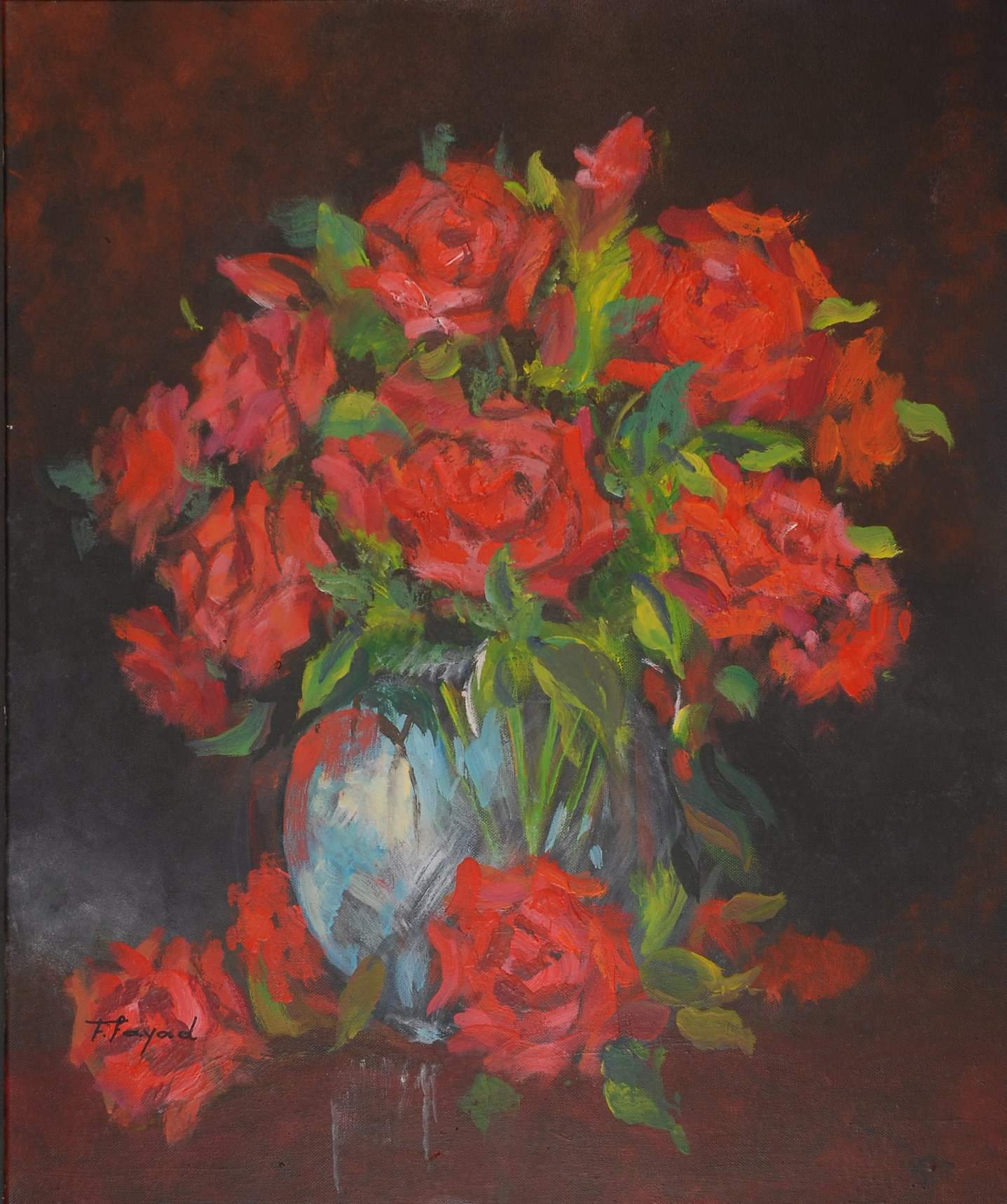 ان المراة في اعمالها سابحة في فضاء اللوحة من خلال الالوان الجميلة و تموجها و مشهد الزهور و الريح في مشهد درامي جميل .