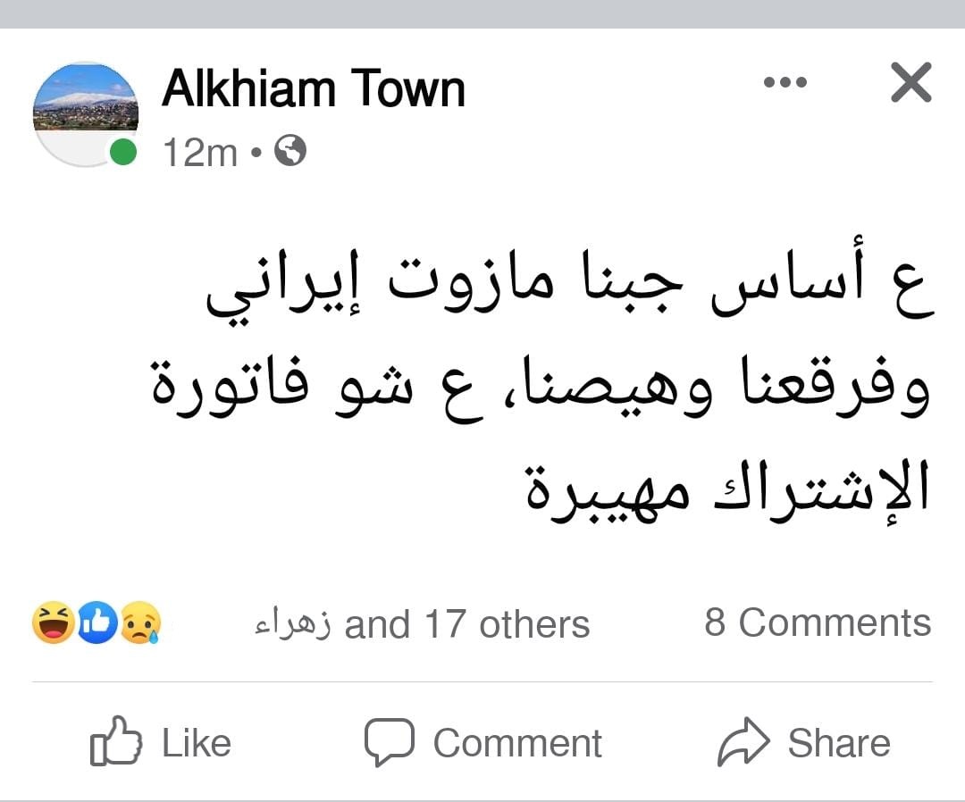 المواطنون تفاءلوا خيراً بعد وصول المازوت الايراني. وكان من الواجب الأخذ بذلك وتخفيض قيمة الكيلوواط ساعة، لكن القيمة تضاعفت هذا الشهر دون أي مبرر أو منطق ولا يدري أحد السبب ولا شفافية.. والأمور فلتانة إذ أن رئيس البلدية يدير المشروع وهو من يراقب نفسه.