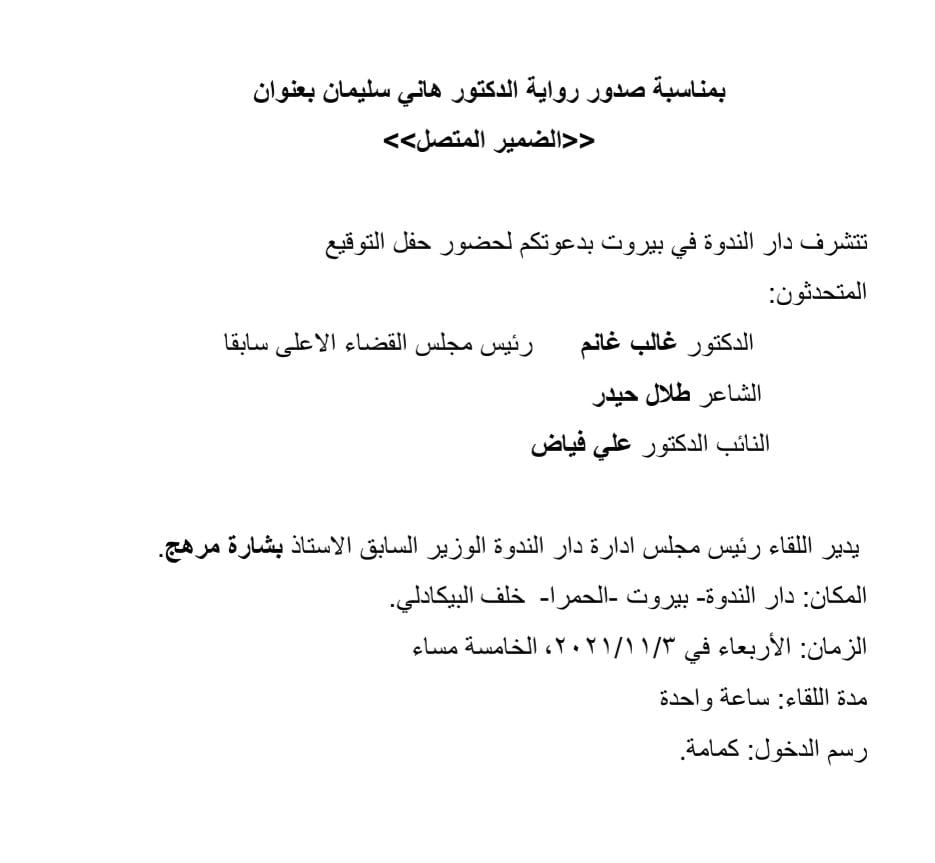 في حفل توقيع رواية "ضمير متصل " للدكتور هاني سليمان الصادرة عن الدار العربية للعلوم ناشرون رغم الظروف الصعبة التي تمر بها البلاد من جائحة كورونا والوضع الاقتصادي فقد غصت "دار الندوة" بحضور عدد من النواب وحشد كبير من المثقفين والكتّاب والمفكرين وممثلون عن الأحزاب والفصائل والجمعيات اللبنانية والفلسطينية أقيمت ندوة تحدث فيها رئيس مجلس إدارة "دار الندوة" الوزير السابق الأستاذ بشارة مرهج، والدكتور غالب غانم رئيس مجلس القضاء الأعلى سابقاً، والنائب الدكتور علي فياض، وكانت كلمة للشاعر طلال حيدر الذي حال المرض دون حضوره فشارك بكلمة أرسلها الى الندوة.