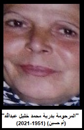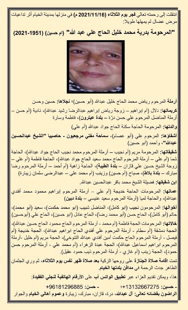 شُيّعت بعد ظهر أمس الثلاثاء (16 تشرين الثاني 2021م) من منزلها في الحي الغربي – محلة المعصرة، الى مثواه الأخير في جبانة بلدتها الخيام، جنازة المغفور لها "بدرية محمد خليل الحاج علي عبدالله" (أم حسين) (1951-2021) – شقيقة سماحة مفتي مرجعيون – حاصبيا الشيخ عبدالحسين عبدالله، وكانت المرحومة قد أسلمت الروح الى بارئها في منزلها فجر يوم الثلاثاء نفسه أثر تداعيات مرض عضال لم يمهلها طويلا.