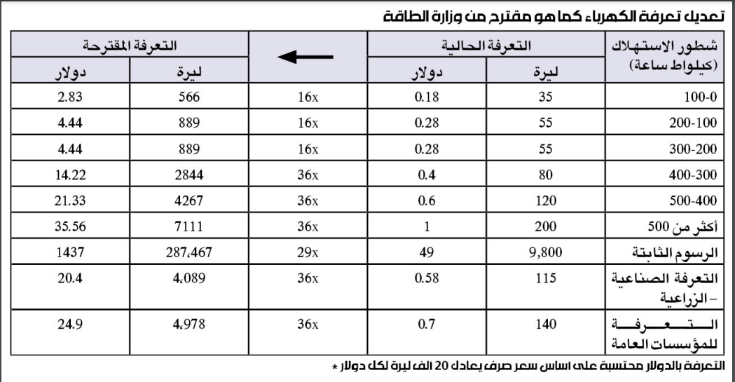 - زيادة التعرفة إلى ما معدّله 20 سنتاً لكل كيلواط وربطها بأسعار النفط العالمية وبتقلبات سعر الصرف لتغطّي تدريجياً الكلفة الإجمالية المترتبة على مؤسسة كهرباء لبنان، وبشكل مخطط له لتقليص مفاعيلها على الأسر الأكثر هشاشة.