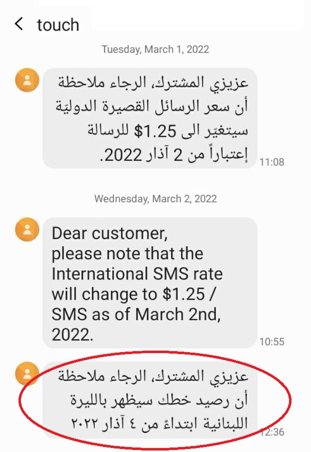 «عزيزي المشترك، الرجاء ملاحظة أن رصيد خطك سيظهر بالليرة اللبنانية ابتداء من 4 آذار 2022». هذه الرسالة تلقاها أمس كل حاملي خطوط «ألفا» و«تاتش» المسبقة الدفع، لإبلاغهم بأن الرصيد المسجّل لديهم بالدولار ستتم «ليلرَته» غداً. يعني ذلك أن من كان يملك، مثلاً، 10 دولارات سيستيقظ ليجد 15 ألف ليرة بدلاً منها بعد احتساب الرصيد على أساس سعر الدولار الرسمي (1500 ليرة). لكن كيف سيُحتسب سعر الدقيقة التي تبلغ قيمتها اليوم 25 سنتاً؟ ستعمد الشركتان إلى احتسابها وفق معادلة السعر الرسمي أي 375 ليرة لبنانية. الأمر نفسه ينسحب على سعر الرسالة النصية، فيما تبقى رزمات الإنترنت على حالها، إلى حين إقرار رفع سعر تعرفة الاتصالات. عندها سيخضع الرصيد لـ«هيركات» ويفقد قيمته الحالية عبر اعتماد معادلة حسابية أخرى وسعر صرف مختلف.