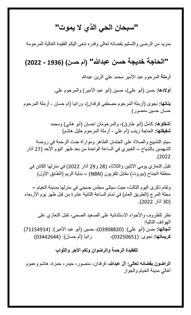 جرت بعد ظهر يوم الأحد (27 آذار (2022) مراسم التشييع والصلاة على الجثمان الطاهر ومواراة جدث الرحمة للمرحومة الحاجة أم حسن خديجة حسن الحاج علي محمد الأفندي عبدالله (١٩٣٦-٢٠٢٢) وذلك في روضة الشهيدين بالشياح – الغبيري (الضاحية الجنوبية)