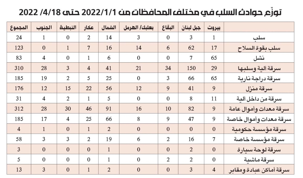 ويظهر جدول عام حصلت عليه "الأخبار" حول كيفية سير حوادث السلب بقوة السلاح والنشل وسرقة دراجات نارية وآليات من 1/1/2022 لغاية 18/4/2022، أكثر من 1500 عملية في مختلف المناطق اللبنانية، احتلت فيه محافظات جبل لبنان بيروت والشمال النسبة الكبرى لتبلغ أكثر من 700 عملية ما يعادل النصف تقريباً، فيما نالت مناطق جبل لبنان (الضاحية منها) حصة الأسد. غير أنه وفي جدول آخر شمل تواريخ محددة من 17/3/2022 إلى 18/4/2022، كان لافتاً تراجع النسبة إلى ما دون النصف سيّما في مناطق جبل لبنان. مردّ ذلك حسبما يظهر، إلى مضامين الخطة الأمنية الجاري تنفيذها في الضاحية. ووفق معلومات "الأخبار"، ستدوم الخطة بوتيرتها التصعيدية الحالية إلى عيد الفطر المقبل، على أن يجري بعدها تطبيق آلية أمنية مُعينة تهدف إلى المحافظة على النتائج التي تم تحقيقها.