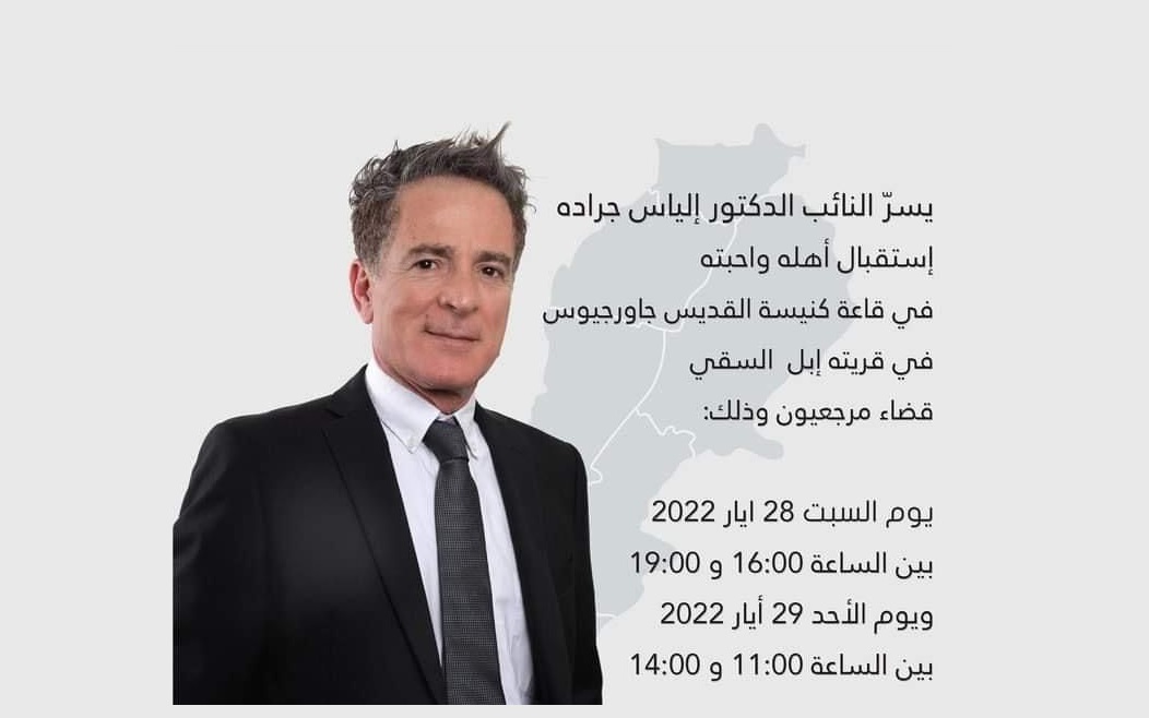 بعد انتخابه نائبا عن مرجعيون حاصبيا، يستقبل النائب الدكتور الياس جرادة المهنئين من أهل وأحبّة في قريته ابل السقي يوم السبت 28 أيار الجاري بين الساعة الرابعة والسابعة عصراً ويوم الأحد 29 منه من الساعة العاشرة صباحا الى الثانية بعد الظهر، وذلك في قاعة كنيسة القديس جاوجيوس.