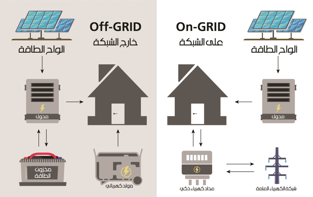 تنقسم أنظمة الطاقة الشمسية إلى قسمين: القسم الأول، عبارة عن طاقة "على الشبكة on grid"، تحتاج إلى التيار الرسمي كي تعمل، وهي تقوم على فكرة ربط الطاقة الكهربائية المنتجة عبر الألواح الشمسية في المنزل بالشبكة العامة، عبر محوّل كهربائي يحوّل خلال ساعات النهار فائض الكهرباء إلى الشبكة مروراً بعدّاد ذكي يحسم قيمة هذه الطاقة من الفاتورة الشهرية، وهو نظام مثالي للتخفيف من قيمة الفاتورة الشهرية ويمكن تطبيقه في القرى اللبنانية في حال ذهبنا إلى إنتاج لامركزي للكهرباء، فتقوم المنازل خلال النهار بالاستفادة من أشعة الشمس لتوليد الكهرباء، وفي ساعات الليل تعمل المولّدات.