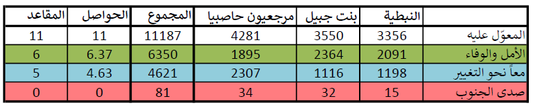 بلغ عدد الناخبين الاجمالي (مقيمين وخارج) في الجنوب الثالثة 497,531 ناخباً، اقترع منهم 238,610 مقترعاً. وبعد حذف الأصوات اللاغية، بلغ الحاصل الانتخابي في الدائرة عموماً 21,110 صوتاً. وقد نالت لائحة الأمل والوفاء 197,822 صوتاً مقابل 30,384 للائحة معاً نحو التغيير.