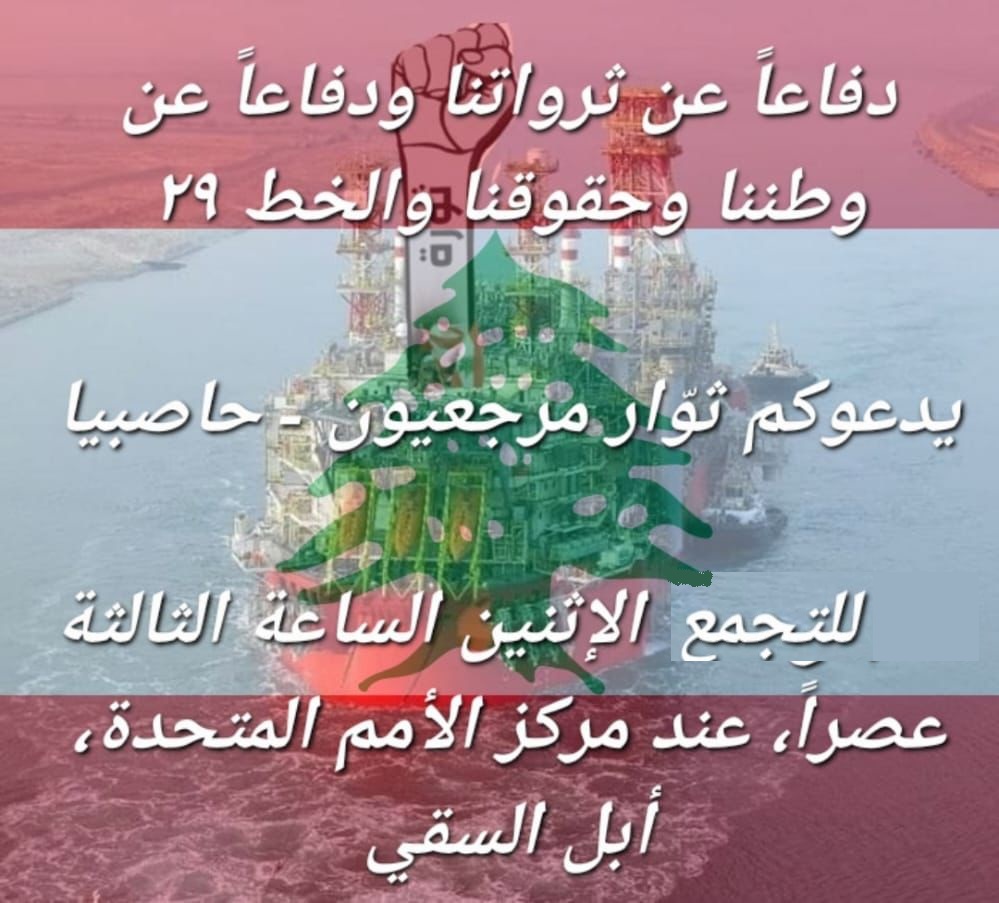 تحت عنوان «دفاعاً عن ثرواتنا ودفاعاً عن وطننا وحقوقنا والخط 29»، دعا ثوار حاصبيا - مرجعيون للتجمع عند الساعة الثالثة بعد ظهر اليوم الاثنين 7 حزيران 2022 عند مركز الأمم المتحدة في ابل السقي.