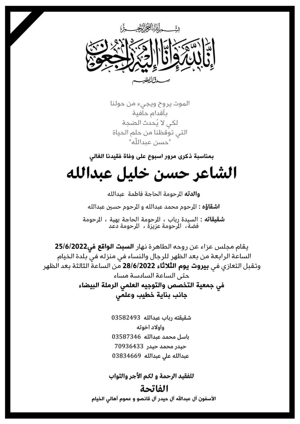 لمناسبة مرور اسبوع على وفاة الشاعر حسن خليل عبدالله، تقام الذكرى يوم السبت ٢٥/٦/٢٠٢٢ وذلك عند الساعة الرابعة من بعد الظهر في منزله في بلدة الخيام.