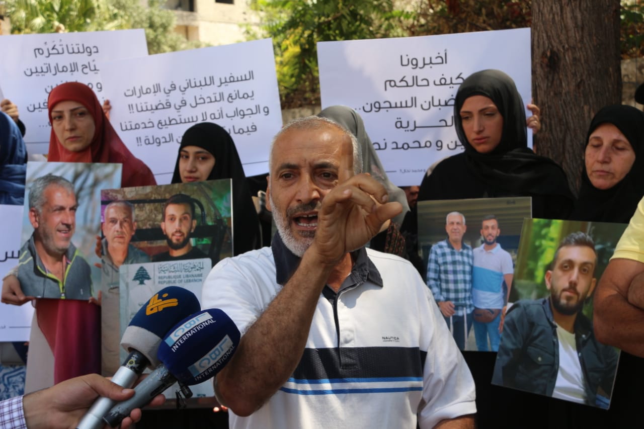 والقى شقيق الموقوف حسين ، محمود علي نحال كلمة باسم المعتصمين تحدث فيها عن معاناتنا كعائلة ، نحن لا نعرف اي خبر عن شقيقي حسين وابنه محمد ، ولن نعرف اساسا لماذا اوقفا ، واين هما الان ، وما مصيرهما، اولادهم يسالون عنهم ، والدتي والدة حسين مريضة والان في المستشفى وتريد ان ترى ابنها، شقيقي كان معيل لـــــ 3 عائلات ، لقد طالبنا بمقابلة الوزير الياس ابو صعب الذي لديه علاقات جيدة مع الاماراتيين وللان لم يرد علينا خبر، لم نج اي مسؤول لبناني بالدولة وبالسلطة الامنية تحرك ، بالامس سعى الجميع للاطلاق سراح الطبيب ريشار خراط من الامارات لم يهدأ اي مسؤول لبناني الا لحين اطلاقه ، وسائل الاعلام التي تغيب اليوم قضيتنا بالامس كانت تسلط الضوء على موضوع توقيف الطبيب خراط ، لماذا هذه العنصرية والفئوية بالتعامل ، ابننا حسين نحال يسافر الى دولة الامارات منذ 30 سنة وهو تاجر ويتنقل في كثير من الدول ، لماذا اوقف واين مصيره ، نريد ان نعرف