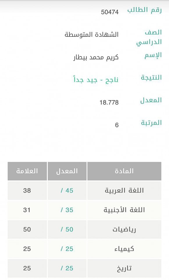 حيث جمع معدل 17.778 ونتيجة جيد جدا ( السادس على مستوى طلاب لبنان) ،