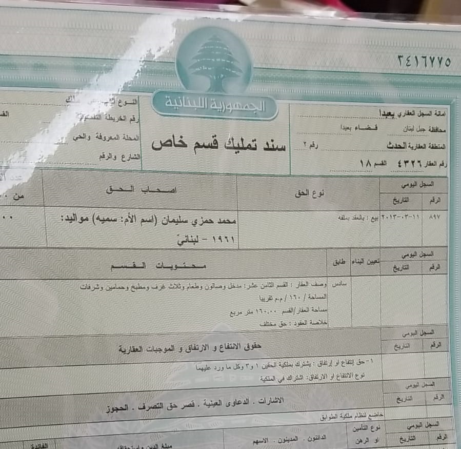 شقة فخمة، في حي الجاموس في ضاحية بيروت الجنوبية، يملكها طبيب، تقرر بيعها لدواعي السفر.