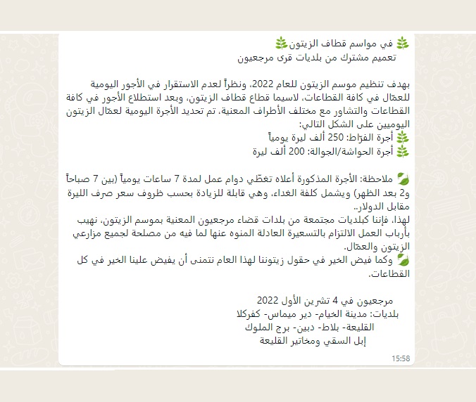 وربما استجابة البلدية لهذا النداء فقامت مشكورة مع بعض بلديات قضاء مرجعيون بتحديد اجور اليد العاملة ل فرط الزيتون ب 250 الف ليرة لمدة سبع ساعات والعداء على العامل و 200 الف ليرة على الحواشة ، وهذا اجر معقول ومقبول بالنسبة لظروف الجميع ، حيث الاجر الشهري في حالة العمل 20 يوم في الشهر 4500 مليون وخمسمائة الف.