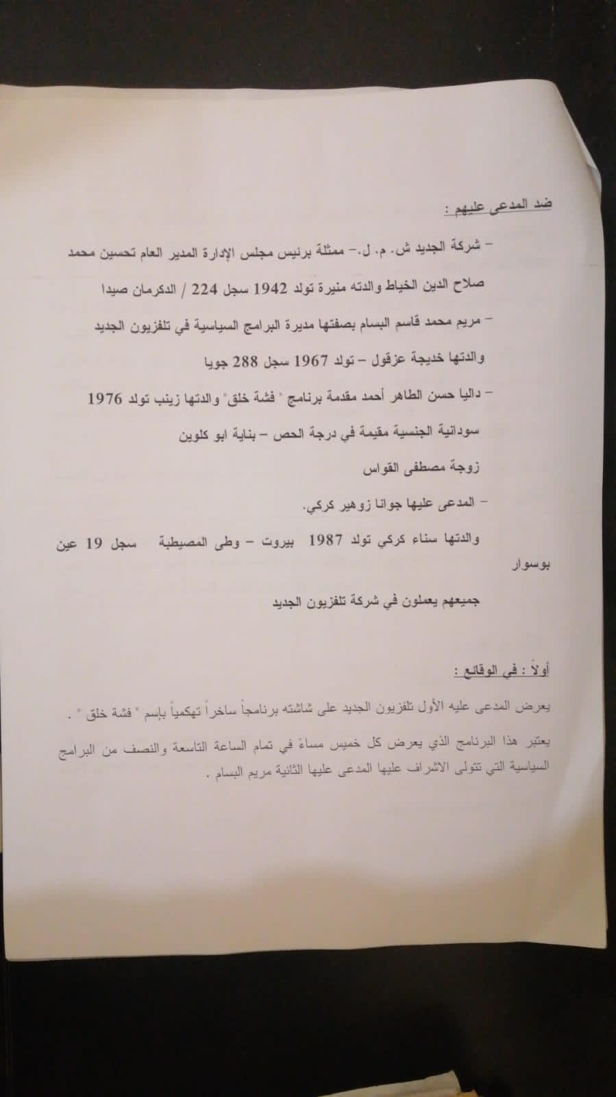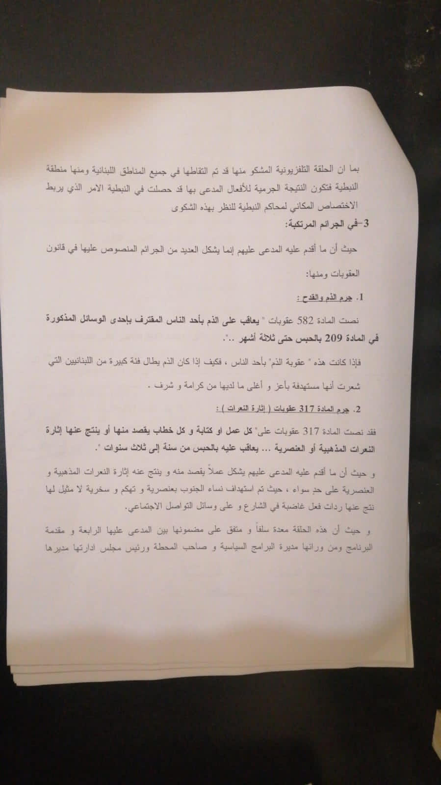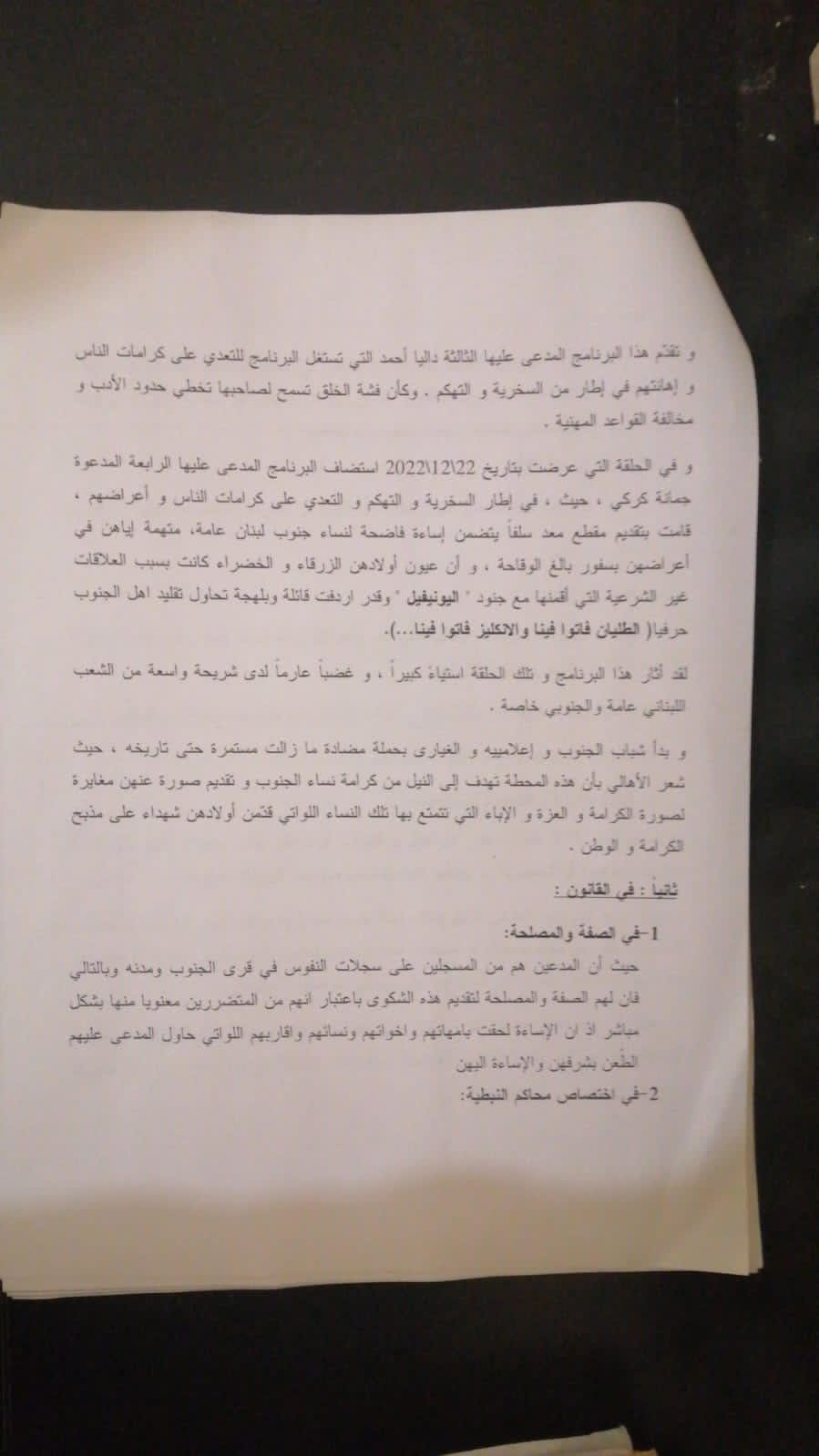 على خلفية الاساءات وانتهاك الحرمات للنساء الجنوبيات التي ارتكبها تلفزيون الجديد من خلال برنامج فشة خلق تقدم عدد من المحامين بشكوى جزائية الى النيابة العامة الاستئنافية في النبطية ضد المدعى عليهم تلفزيون الجديد ومديرة البرامج السياسية مريم البسام ومقدمة برنامج فشة خلق داليا أحمد والمدعوة جوانا كركي بجرائم القدح والذم واثارة النعرات العنصرية والأمور بعهدة القضاء..