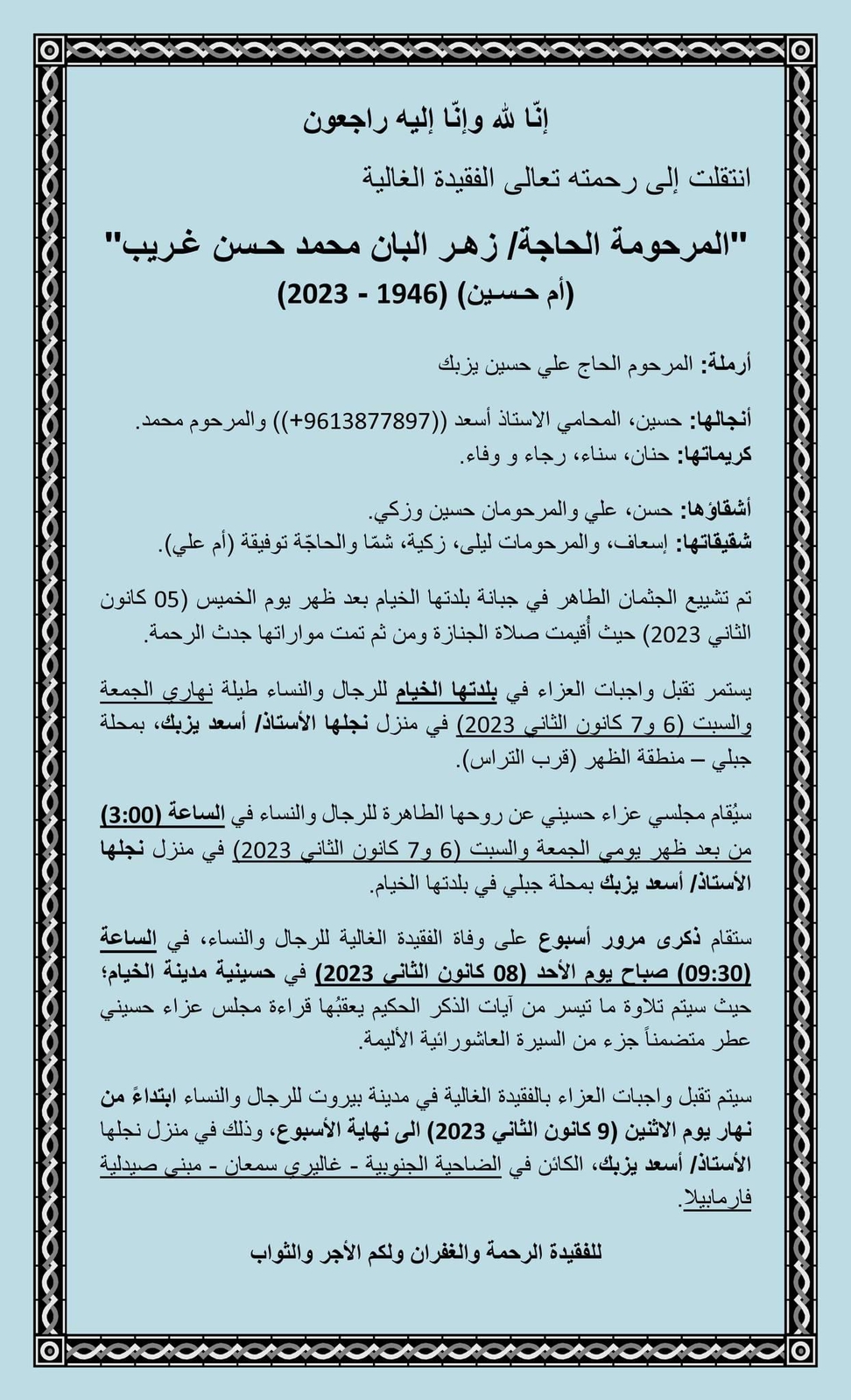 تتقبّل عائلة المرحومة الحاجّة زهرة البان محمد غريب (أم حسين يزبك) العزاء يومي الجمعة والسبت (6 و7 ك2 2023) في بلدتها الخيام بمنزل نجلها المحامي الأستاذ أسعد يزبك الكائن بمحلة جبلي - منطقة الظهر.