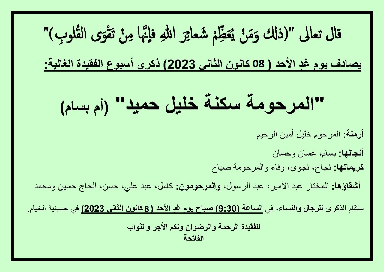 تقام الذكرى للرجال والنساء، في الساعة (9:30) صباح يوم غدٍ الأحد (9 كانون الثاني 2023) في حسينية الخيام.