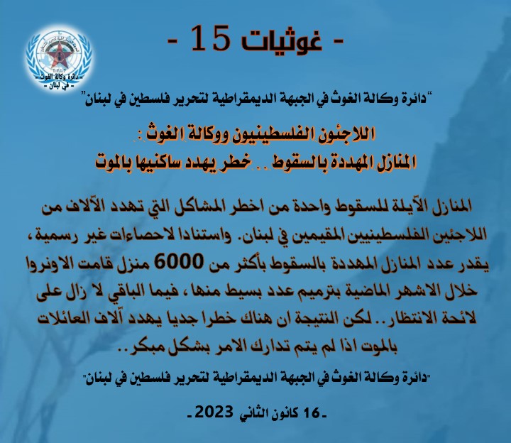 صدر عن دائرة وكالة الغوث في الجبهة الديمقراطية لتحرير فلسطين في لبنان البيان التالي: