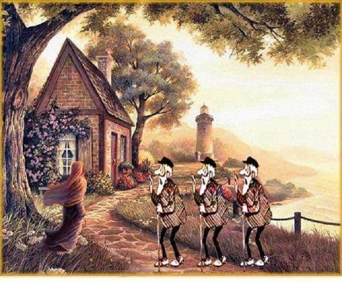خرجت إمرأه من منزلها فرأت ثلاثة شيوخ لهم لحى بيضاء طويلة وكانوا جالسين في فناء منزلها.. لم تعرفهم .. وقالت لا أظنني اعرفكم ولكن لابد أنكم جوعى ! أرجوكم تفضلوا بالدخول لتأكلوا.
