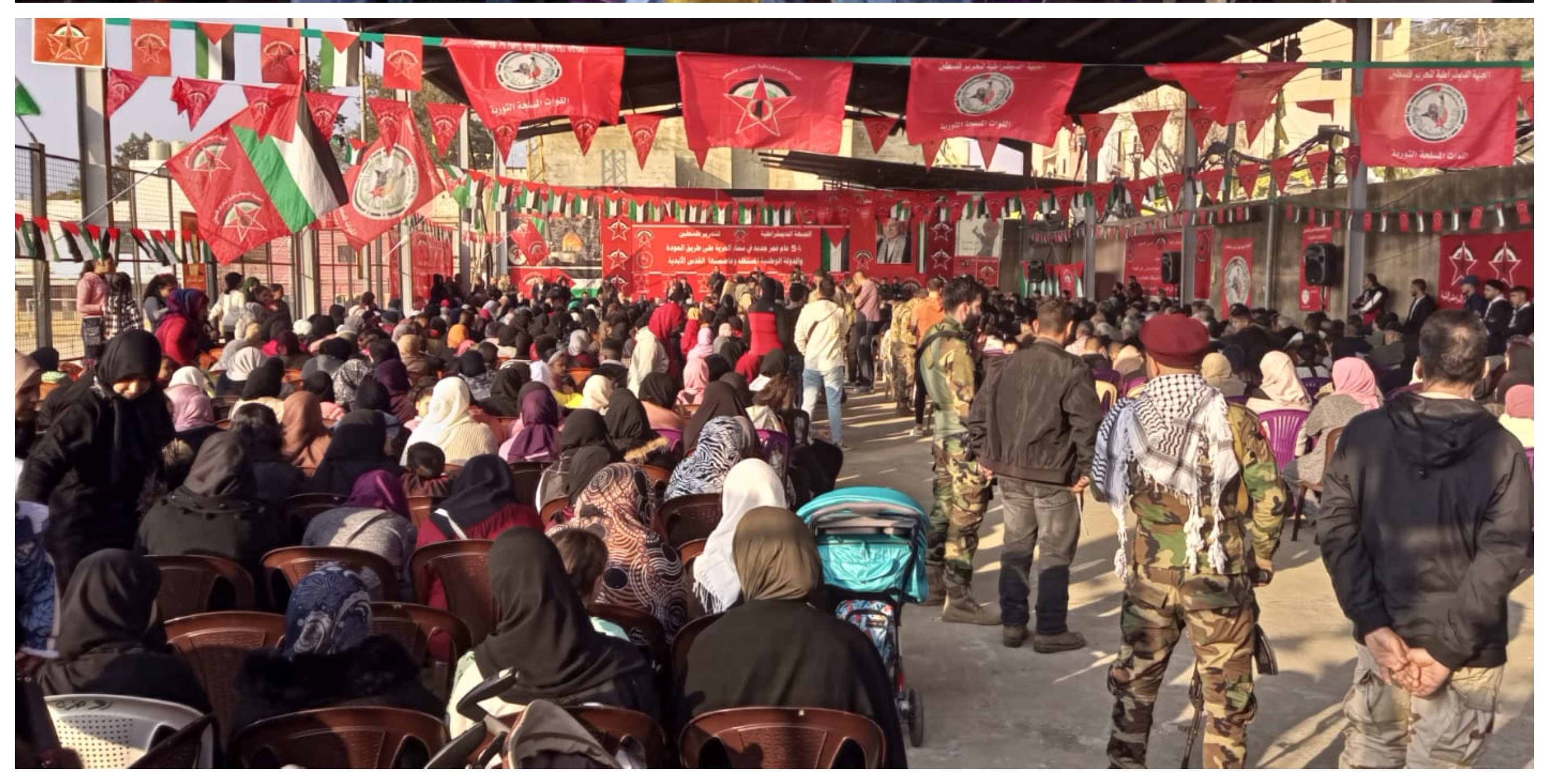 غص الملعب الرياضي في مخيم عين الحلوة للاجئين الفلسطينيين بمدينة صيدا جنوب لبنان بالحشود السياسية والجماهيرية والشعبية الكبيرة للمشاركة في المهرجان الوطني والسياسي والجماهيري الذي نظمته الجبهة الديمقراطية لتحرير فلسطين بذكرى انطلاقتها الرابعة والخمسين.